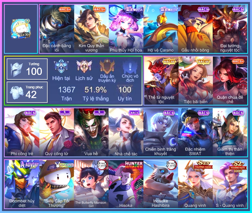 Valhein Hoàng tử Quạ, Valhein Xạ Thần, Valhein S-Quang Vinh, Triệu Vân Thần Tài, Krixi Phó văn nghệ, Krixi Thần Thoại Hy Lạp, Krixi Thuỷ Thủ, Mina Đào tạo siêu sao, Mganga Hề cung đình, Mganga Pháp sư mèo, Grakk Khô Lâu Đại Tướng, Butterfly Teen Nữ Công Nghệ, Butterfly Nữ Quái Nổi Loạn, Maloch Ác Ma Địa Ngục, Maloch Đại ca Mukbang, Telannas Dạ hội, TelAnnas Quang Vinh, Gildur phượt thủ, Gildur Đại gia học viện, Stuart Gã hề, Taara Hỏa Ngọc Nữ Đế, Kahlii Siêu đầu bếp, Kahlii Tử điệp, Lauriel Đọa Lạc Thiên Sứ, Lauriel Hỏa Phượng Hoàng, Lauriel Nữ vương học đường 2, Wisp Hải Tặc Nhí, Wisp Ếch nhồi bông, Annette Nữ quản ga, Slimz Chú thỏ ngọc, Slimz Sứ giả Thiên giới, Điêu Thuyền Nữ Vương Anh Đào, Natalya Quý Cô Thủy Tề, Zephys Tư lệnh viễn chinh, Amily Hội ám hoàng, Iggy Tiểu Hoàng Đế, Ilumia Thiên nữ áo dài, Ilumia Ngược dòng thời gian, Sinestrea Giấc mơ trưa, Volkath Tư lệnh viễn chinh, Arum Thú Vệ Cổ Mộ, Capheny Thần tượng âm nhạc, Veera Goá Phụ, Veera Y Tá Bạo Loạn, Tulen Phù Thủy Kiến Tạo, Tulen Dạ hội, Ngộ Không Cổ thần Ai Cập, Rouie Sứ giả vũ trụ, Rouie Quang Vinh, Violet Nữ đặc cảnh, Violet Đặc Dị, Violet Huy Chương Vàng, Aya Điệp viên ký ức, Qi Tiểu long, Qi Thiếu nữ mùa xuân, Qi Blogger Ẩm thực, Lindis Đồng phục Shihakusho, Liliana Hồ Quý Phi, Liliana thần tượng âm nhạc, Zip Cá siêu quậy, Alice Dạ hội, Alice The Butterfly Mansion Girl, Laville Kim quy thần vương, Yorn Soái ca bãi biển, Yena Nữ hoàng thể thao, Yena Nữ cướp biển, Roxie Thám tử tập sự, Roxie Lễ hội hoa, Roxie Hỏa thuật sư, Ata Mèo đi mưa, Elandorr Phi vụ thế kỷ, Elandorr Học viện Carano, Airi Đặc công tử điệp, Raz Saitama Cosplay, Raz Mãnh lôi thần quyền, Fennik Nhà thám hiểm, Fennik Đội đặc nhiệm, Fennik Tay đua F1, Fennik Shipper Siêu thanh, Aleister Quỷ soái nguyệt tộc, Omega Hộ vệ ba bích, Zuka Rapper Big Panda, Omen Chiến binh trăng khuyết, Hayate Bạch lang, Sephera Quý tiểu thư, Celica Tâm hồn trà sữa, Zill Diệt nguyệt tử sĩ, Darcy Nam tước, Quillen Đặc công mãng xà, Quillen Tà linh ma đao, Murad S-Quang Vinh, Richter Quang vinh 2.0, Keera Nghệ sĩ Graffiti, Bright Kỳ Lân Soái, Enzo Thần thoại Hy Lạp, Rourke Cuồng tặc, Lữ Bố Vũ điệu Samba, Jinna Hỏa nhãn ma vương, Azzenka Quang Vinh 2.0