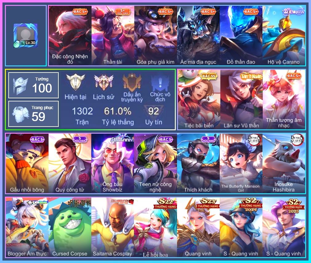 Arthur Siêu sao Cricket, Arthur Đặc cảnh băng lôi, Krixi Xứ Sở Thần Tiên, Krixi Tiệc Bãi Biển, Krixi Cô Tiên Thỏ, Krixi Phó văn nghệ, Krixi Thuỷ Thủ, TelAnnas Giám thị thân thiện, Telannas Dạ hội, Valhein Số 7 Thần Sầu, Valhein S-Quang Vinh, Butterfly Teen Nữ Công Nghệ, Violet Phi Công Trẻ, Violet Huy Chương Vàng, Natalya Quý Cô Thủy Tề, Triệu Vân Quý Công Tử, Zuka Đầu bếp hoàng cung, Zuka Rapper Big Panda, Veera Vũ hội bóng đêm, Veera Kimono, Veera Phù thủy Hội họa, Điêu Thuyền Nữ y tá, Điêu Thuyền Mèo công nghệ, Alice Bé Gấu Tuyết, Alice Xứ sở thần tiên, Alice Dạ hội, Alice The Butterfly Mansion Girl, Yorn Đặc Nhiệm Swat, Yorn Soái ca bãi biển, Rouie Sứ giả vũ trụ, Rouie Quang Vinh, Iggy Bạch hồ ly, Bonnie S Quang Vinh, Celica S-Quang Vinh, Liliana thần tượng âm nhạc, Sephera Phi vụ thế kỷ, Sephera Thủy Liên Hoa, Errol Stream đến bao giờ, Murad S-Quang Vinh, Lauriel Nữ vương học đường 2, Kahlii Kim cô giáo chủ, Kahlii Tử điệp, Hayate Bạch lang, Mganga Quái tặc không gian, Mganga Doombot Hủy Diệt, Capheny Hầu gái, Maloch Samurai Tử Sĩ, Maloch Đại ca Mukbang, Taara Hỏa Ngọc Nữ Đế, Ishar Giấc Mơ Ngọt Ngào, Arum Thú Vệ Cổ Mộ, Airi Cấm Vệ Nguyệt Tộc, Raz Siêu việt, Ilumia Ngược dòng thời gian, Omega Cỗ Máy Siêu Tốc, Omega Hộ Vệ Carano, Richter Quang vinh 2.0, Keera Nghệ sĩ Graffiti, Bright Kỳ Lân Soái, Ignis Bắc băng vương, Yena Nữ hoàng thể thao, Omen Sĩ Quan Viễn Chinh, Annette Xứ sở thần tiên, Tachi Đao khách vô tình, Slimz Siêu Cấp Tối Thượng, Sinestrea S-Quang vinh, Marja Linh Xà Tư Tế, Volkath Quang vinh, Zill Quái xế, Thorne Thám tử trung họ