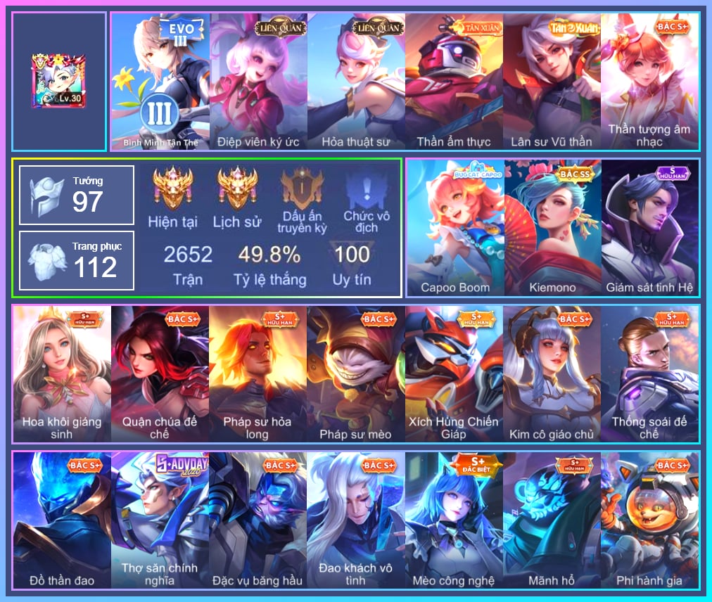 Arthur Si Tình Kiếm, Arthur Siêu sao Cricket, Arthur Đặc cảnh băng lôi, Krixi Phó văn nghệ, Telannas Thánh nữ mật hội, Telannas Dạ hội, Tel Annas Jujutsu Sorcerer, Butterfly Teen Nữ Công Nghệ, Butterfly Quận Chúa Đế Chế, Butterfly Bình Minh Tận Thế, Violet Phó học tập, Violet Tay Súng Siêu Phẩm, Violet Huy Chương Vàng, Zuka Đại Phú Ông, Zuka Gấu Nhồi Bông, Zuka Mãnh hổ, Zuka Xích Hùng Chiến Giáp, Triệu Vân Quý Công Tử, Omen Sĩ Quan Viễn Chinh, Alice Nhà chiêm tinh, Alice Dạ hội, Amily Đặc cảnh NYPD, Amily Nữ đội trưởng, Amily Thám tử trung học, Liliana thần tượng âm nhạc, Ignis Bắc băng vương, Ignis Vì sao con khóc, Errol Diệt nguyệt tiên phong, Điêu Thuyền Mèo công nghệ, Grakk Thuyền Trưởng Râu Đỏ, Grakk Thần ẩm thực, Lauriel Hoa khôi Giáng sinh, Mganga Pháp sư mèo, Mganga Doombot Hủy Diệt, Kahlii Kim cô giáo chủ, Gildur Đại gia học viện, Yorn Đặc Nhiệm Swat, Ngộ Không Đặc vụ băng hầu, Ngộ Không Nhóc tỳ bá đạo, Ngộ Không Cổ thần Ai Cập, Maloch Samurai Tử Sĩ, Maloch Ác nhân vô tuyến, Maloch Đại ca Mukbang, Richter Dạ hội, Richter Quang vinh 2.0, Tulen Đông êm đềm, Elandorr Phi vụ thế kỷ, Elandorr Học viện Carano, Zephys Đầu bếp Sashimi, Fennik Nhà thám hiểm, Fennik Phi hành gia, Florentino Vũ kiếm sư, Florentino Giám sát tinh hệ, Florentino Kiếm sĩ Olympic, Florentino S-Quang Vinh, Azzenka Quang Vinh 2.0, Airi Kiemono, Airi Đặc công tử điệp, Baldum Đồ chơi, Mina Đào tạo siêu sao, Aya Điệp viên ký ức, Roxie Hỏa thuật sư, Sinestrea Lữ khách sa mạc, Sinestrea S-Quang vinh, Ybneth Candy Bear, Nakroth Quán quân, Nakroth Siêu Việt 1, Max Trà Chanh, Elsu Mafia, Elsu Tuyết ưng, Veres Đạo tặc, Zill Thần mộng mị, Murad Thợ Săn Tiền Thưởng, Murad Đồ thần đao, Murad Điệp viên Anubis, Quillen Thống soái đế chế, Darcy Pháp sư hỏa long, Kaine Thợ Săn Chính Nghĩa, Ryoma Đại Tướng Nguyệt Tộc, Ryoma Dạ hội, Zip Ông trùm giáng sinh, Slimz Lẩu chua cay, Slimz Siêu Cấp Tối Thượng, Raz Đại tù trưởng, Raz Saitama Cosplay, Capheny S-Quang Vinh, Thane Mật vụ, Thane Khoảnh khắc vinh quang, Dextra Lữ khách cao nguyên, Keera Hồ điệp, Sephera Thủy Liên Hoa, Xeniel Shipper bánh mỳ, Enzo Phẩm chất quý tộc, Celica S-Quang Vinh, Tachi S-Vinh Quang, Tachi Đao khách vô tình, Annette Xứ sở thần tiên, Allain Lân sư Vũ thần, Volkath Dạ Huyết Tộc, Volkath Quang vinh, Hayate Bạch ảnh, Hayate Bạch lang, Hayate Bạch vô thường, KilGroth Cảnh Vệ Biển, Teemee Giấc Mơ Ngọt Ngào, Bonnie S Quang Vinh, Lữ Bố Hoả Long Chiến Thần, Thorne Thám tử trung học, Ishar Tiểu thư gấu trúc, Ishar Capoo Boom, Krizzix Crursed Corpse, Ilumia Thiên nữ áo dài