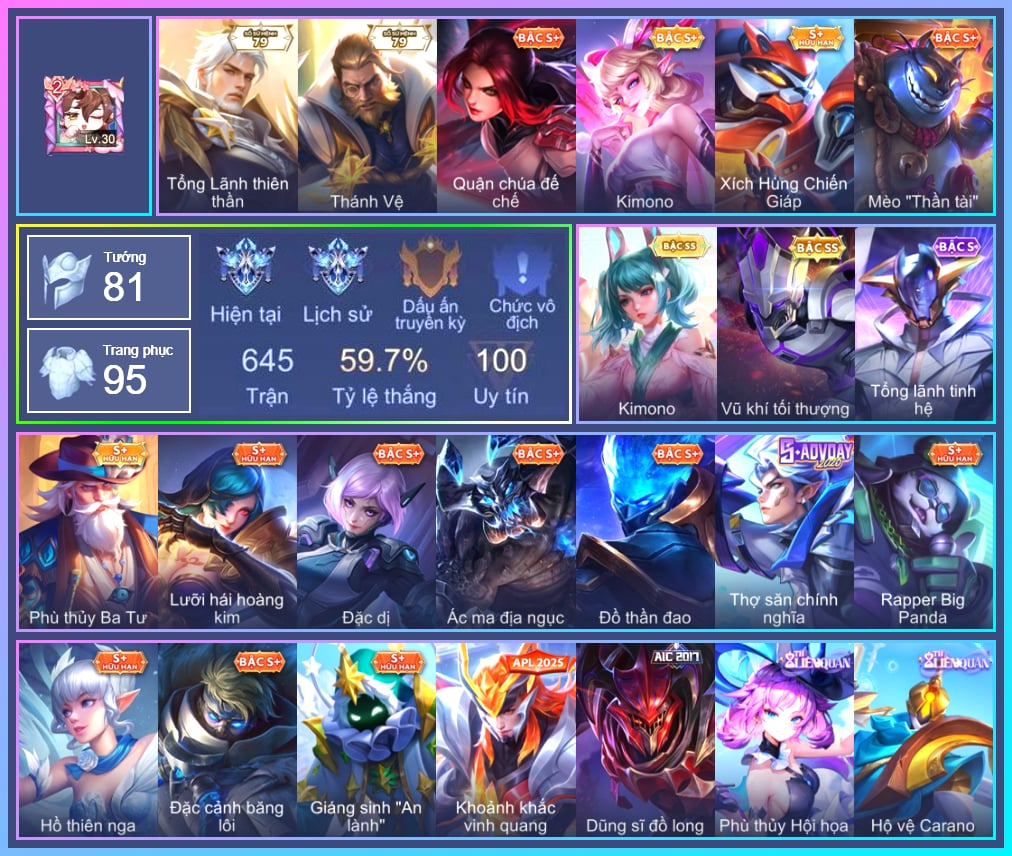 Arthur Siêu sao Cricket, Arthur Đặc cảnh băng lôi, Krixi Xứ Sở Thần Tiên, Krixi Phó văn nghệ, Krixi Hồ Thiên Nga, Krixi Thuỷ Thủ, TelAnnas Giám thị thân thiện, Telannas Dạ hội, Valhein Vũ khí tối thượng, Butterfly Quận Chúa Đế Chế, Violet Đặc Dị, Violet Huy Chương Vàng, Airi Ninja Xanh Lá, Capheny Hầu gái, Capheny Kimono, Capheny S-Quang Vinh, Alice Xứ sở thần tiên, Alice Dạ hội, Zuka Rapper Big Panda, Zuka Xích Hùng Chiến Giáp, Yorn Đặc Nhiệm Swat, Stuart Vua hề, Ngộ Không Đạo tặc, Ngộ Không Cổ thần Ai Cập, Natalya Quý Cô Thủy Tề, Triệu Vân Dũng Sĩ Đồ Long, Veera Cô giáo hắc ám, Veera Kimono, Veera Phù thủy Hội họa, Maloch Ác Ma Địa Ngục, Maloch Tiệc hóa trang, Maloch Ác nhân vô tuyến, Grakk Mèo thần tài, Gildur phượt thủ, Gildur Phù thủy Ba Tư, Celica S-Quang Vinh, Celica Tâm hồn trà sữa, Florentino Vũ kiếm sư, Florentino S-Quang Vinh, Bright Kỳ Lân Soái, Errol Vượt ngục, Ignis Bắc băng vương, Fennik Nhà thám hiểm, Fennik Shipper Siêu thanh, Richter Quang vinh 2.0, Richter Tổng Lãnh Thiên Thần, Ryoma Ailing Samurai, Baldum Đồ chơi, Ishar Tiểu Thư, Aoi Sát Thủ Đô Thị, Enzo Phẩm chất quý tộc, Enzo Thần thoại Hy Lạp, Enzo Nhà Leo núi, Raz Đại tù trưởng, Raz Saitama Cosplay, Yena Nữ hoàng thể thao, Yan nhà chế tác, Kahlii Rối Nước Thuỷ Đình, Mganga Doombot Hủy Diệt, Toro Trung Phong Cắm, Quillen Trưởng ngoại khoa, Annette Xứ sở thần tiên, Tachi Đao khách vô tình, Zephys Tư lệnh viễn chinh, Omega Hộ Vệ Carano, Sinestrea S-Quang vinh, Slimz Sứ giả Thiên giới, Dextra Quý cô Tuổi Dần, Hayate Bạch ảnh, Hayate chiến binh trăng khuyết, Hayate Bạch lang, Ilumia Diva nổi loạn, Marja Linh Xà Tư Tế, Omen Sĩ Quan Viễn Chinh, Omen Chiến binh trăng khuyết, Murad Thợ Săn Tiền Thưởng, Murad Đồ thần đao, Astrid Bạch Kiếm Tiểu Thư, Astrid Nữ tổng tài, Lindis Thám Tử Tư, Bonnie S Quang Vinh, Kaine Thợ Săn Chính Nghĩa, Max Trà Chanh, Thane Khoảnh khắc vinh quang, Rourke Thánh Vệ, Tulen Phù Thủy Kiến Tạo, Mina Lưỡi hái hoàng kim, Volkath Dạ Huyết Tộc, Amily Thám tử trung học, KilGroth Cảnh Vệ Biển, Paine khúc nhạc tử vong, Arum Linh tượng vu nữ, AzzenKa Giáng sinh An lành, Aleister S - Quang Vinh, Xeniel Tổng lãnh tinh hệ