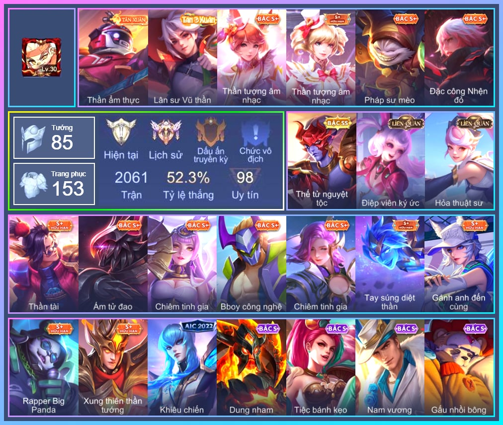 Valhein Hoàng tử Quạ, Valhein S-Quang Vinh, Triệu Vân Thần Tài, Krixi Xứ Sở Thần Tiên, Krixi Thuỷ Thủ, Mina Tiểu thư đoạt hồn, Toro Bạch mao Ngưu, Taara Đại tù trưởng, Taara Hỏa Ngọc Nữ Đế, Veera Bách hoa tiên nữ, Gildur phượt thủ, Gildur Đại gia học viện, Nakroth Siêu Việt 1, Stuart Trò đùa tử vong, Stuart Gã hề, Zill Lốc Địa Ngục, Zill Dung nham, Zill Thần mộng mị, Tulen Nhà Thám Hiểm, Tulen Tân Thần Thiên Hà, Tulen Phù Thủy Kiến Tạo, Tulen Phó kỷ luật, Tulen Dạ hội, Tulen Hoả thần long tộc, Tulen Tiêu Dao Vũ Thần, Marja Linh Xà Tư Tế, Murad Thợ Săn Tiền Thưởng, Murad M-TP Thần Tượng Học Đường, Murad S-Quang Vinh, Lữ Bố Nam Vương, Lữ Bố Hoả Long Chiến Thần, Quillen Trưởng ngoại khoa, Quillen Đặc công mãng xà, Ignis Hỏa Thuật Sư, Ignis Quang Vinh, Ignis Vì sao con khóc, Điêu Thuyền Mèo công nghệ, Lindis Quang Vinh, Natalya Quý Cô Thủy Tề, Xeniel Thiên Sứ Hủy Diệt, Xeniel Kim sí điểu, Wisp Hải Tặc Nhí, Arduin, Arduin Quang Vinh, Arduin Tà linh hiệp sỹ, Aleister Thiếu Niên Hắc Ám, Aleister Quỷ soái nguyệt tộc, Alice Nhà chiêm tinh, Alice Xứ sở thần tiên, Zuka Phát Tài, Zuka Gấu Nhồi Bông, Zuka Đầu bếp hoàng cung, Zuka Rapper Big Panda, Hayate Bạch ảnh, Hayate Bạch lang, Richter Dạ hội, Richter Quang vinh 2.0, Elsu Tuyết ưng, Enzo Phẩm chất quý tộc, Enzo Thần thoại Hy Lạp, Enzo Nhà Leo núi, Violet Nữ đặc cảnh, Violet Phó học tập, Errol Vượt ngục, Errol Diệt nguyệt tiên phong, Kriknak Bọ Cánh Bạc, Kriknak Yêu trùng cổ mộ, Max Quang Vinh, Keera Học viên Carano, Dirak Quý tộc, Elandorr Học viện Carano, Volkath Xung thiên thần tướng, Volkath Tư lệnh viễn chinh, Volkath Quang vinh, Fennik Nhà thám hiểm, Fennik Shipper Siêu thanh, Preyta Phi cơ F1, Paine khúc nhạc tử vong, Roxie Lễ hội hoa, Grakk Thuyền Trưởng Râu Đỏ, Grakk Màu cờ sắc áo, Bright Kỳ Lân Soái, Cresht Thợ sửa cáp, Zephys Tư lệnh viễn chinh, Butterfly Teen Nữ Công Nghệ, Butterfly Quận Chúa Đế Chế, Butterfly Bình Minh Tận Thế, Laville Tay súng vô địch, Laville Kim quy thần vương, Laville Thám tử học đường, Qi Đặc vụ cáo tuyết, Qi Thiếu nữ pháo hoa, Qi Blogger Ẩm thực, Ybneth Candy Bear, Airi Cấm Vệ Nguyệt Tộc, Airi Lễ hội mùa xuân, Lorion Chiến giáp hắc ám, Moren Anh thợ điện, Florentino Kiếm sĩ Olympic, Florentino S-Quang Vinh, Arum Thú Vệ Cổ Mộ, Thorne Giả kim thuật sư, Thorne Thám tử trung học, Maloch Ác Ma Địa Ngục, Maloch Ác nhân vô tuyến, Sinestrea S-Quang vinh, Raz Đại tù trưởng, Ryoma Dạ hội, Mganga Doombot Hủy Diệt, TelAnnas Giám thị thân thiện, TelAnnas Chung Tình Tiễn, Telannas Thánh nữ mật hội, Telannas Dạ hội, TelAnnas Quang Vinh, Tel Annas Jujutsu Sorcerer, Yena Nữ cướp biển, Ata Quang vinh, Celica S-Quang Vinh, Zip Tiểu đệ hổ báo, Azzenka Quang Vinh 2.0, Omen Ám tử đao, Rouie Quang Vinh, Lauriel Nữ vương học đường 2, Amily Đặc công nhện đỏ, Amily Hội ám hoàng, Amily Thám tử trung học, Arthur Siêu sao Cricket, Ishar Giấc Mơ Ngọt Ngào, Ishar Quận chúa sông Nile, Capheny S-Quang Vinh, Kaine Đôi Cánh Đại Dương, Kaine Người dơi, Kaine Thợ Săn Chính Nghĩa, Ilumia Diva nổi loạn, Sephera Chiêm tinh gia, Sephera Phi vụ thế kỷ, Ngộ Không Đạo tặc, Ngộ Không Cổ thần Ai Cập, Tachi Đao khách vô tình, Liliana Thuỷ thủ hồ ly, Slimz Sứ giả Thiên giới, Slimz Siêu Cấp Tối Thượng, Annette Xứ sở thần tiên, Dolia Môn đồ tập sự, Bonnie S Quang Vinh