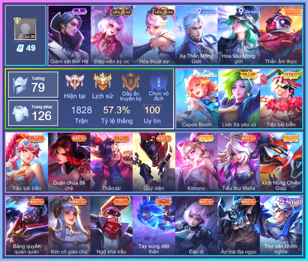 Valhein Hoàng tử Quạ, Valhein Số 7 Thần Sầu, Valhein S-Quang Vinh, TelAnnas Giám thị thân thiện, Telannas Thánh nữ mật hội, Telannas Dạ hội, TelAnnas Quang Vinh, Tel Annas Jujutsu Sorcerer, Arthur Siêu sao Cricket, Arthur Đặc cảnh băng lôi, Krixi Xứ Sở Thần Tiên, Krixi Cô Tiên Thỏ, Krixi Phó văn nghệ, Krixi Thuỷ Thủ, Violet Phi Công Trẻ, Violet Đặc Dị, Violet Huy Chương Vàng, Butterfly Teen Nữ Công Nghệ, Butterfly Quận Chúa Đế Chế, Triệu Vân Thần Tài, Maloch Ác Ma Địa Ngục, Maloch Đại ca Mukbang, Veera Kimono, Stuart Vua hề, Stuart Gã hề, Alice Xứ sở thần tiên, Grakk Thần ẩm thực, Yorn Cung thủ bóng đêm, Yorn Đặc Nhiệm Swat, Yorn Soái ca bãi biển, Lữ Bố Tiệc Bãi Biển, Lữ Bố Nam Vương, Zephys Oán linh, Zephys Tư lệnh viễn chinh, Ngộ Không Đạo tặc, Ngộ Không Ngộ Khá Trẩu, Ngộ Không Đặc vụ băng hầu, Ngộ Không Cổ thần Ai Cập, Kahlii Kim cô giáo chủ, Nakroth Quán quân, Toro Trung Phong Cắm, Gildur Đại gia học viện, Omega Hộ vệ ba bích, Omega Hộ Vệ Carano, Mganga Doombot Hủy Diệt, Fennik Nhà thám hiểm, Fennik Đội đặc nhiệm, Fennik Tay đua F1, Fennik Shipper Siêu thanh, Mina Linh Xà yêu vũ, Aoi Tiểu thư Mafia, Yan Nghệ nhân trung thu, Kaine Thiếu chủ bóng đêm, Kaine Thợ Săn Chính Nghĩa, Elsu Tuyết ưng, Elsu Xạ Thần Mộng Giới, Raz Đại tù trưởng, Raz Băng Quyền Quán Quân, Raz Saitama Cosplay, Dextra Lữ khách cao nguyên, Zill Thần mộng mị, Zill Quái xế, Bright Kỳ Lân Soái, Taara Hỏa Ngọc Nữ Đế, Taara Shion, Liliana Thuỷ thủ hồ ly, Slimz Sứ giả Thiên giới, Zuka Gấu Nhồi Bông, Zuka Rapper Big Panda, Zuka Xích Hùng Chiến Giáp, Ilumia Ngược dòng thời gian, Tulen Đông êm đềm, Tulen Dạ hội, Qi Blogger Ẩm thực, Thane Kẻ Hủy Diệt, Thane Khoảnh khắc vinh quang, Thorne Ước nguyện giáng sinh, Thorne Thám tử trung học, Hayate Bạch ảnh, Hayate Quỷ diện, Hayate Bạch lang, Max Tiểu King Kong, Max Trà Chanh, KilGroth Cảnh Vệ Biển, Amily Thám tử trung học, Sephera Thủy Liên Hoa, Errol Sát thủ Mafia, Murad Thợ Săn Tiền Thưởng, Murad M-TP Thần Tượng Học Đường, Aya Điệp viên ký ức, Paine khúc nhạc tử vong, Florentino Vũ kiếm sư, Florentino Giám sát tinh hệ, Florentino Hisoka, Florentino S-Quang Vinh, Celica S-Quang Vinh, Celica Tâm hồn trà sữa, Ignis Bắc băng vương, Ignis Vì sao con khóc, Richter Quang vinh 2.0, Richter Cứu hộ, Airi Tiệc bãi biển, Airi Đặc công tử điệp, Roxie Hỏa thuật sư, Azzenka Ghẹo hay kẹo, Azzenka Quang Vinh 2.0, AzzenKa Giáng sinh An lành, Azzenka U Hồn Sa Mạc, Sinestrea Lữ khách sa mạc, Sinestrea S-Quang vinh, Capheny S-Quang Vinh, Xeniel Shipper bánh mỳ, Ryoma Ailing Samurai, Aleister Xứ sở thần tiên, Aleister S - Quang Vinh, Annette Băng kỳ lâm, Enzo Phẩm chất quý tộc, Enzo Nhà Leo núi, Keera Nghệ sĩ Graffiti, Dolia Môn đồ tập sự, Volkath Xung thiên thần tướng, Volkath Quang vinh, Laville Tay súng diệt thần, Bonnie S Quang Vinh, Ybneth Candy Bear, Zip Gà siêu quậy, Ishar Capoo Boom, Caesar Bão tố, Krizzix Crursed Corpse, Yena Hoa tiêu Mộng giới