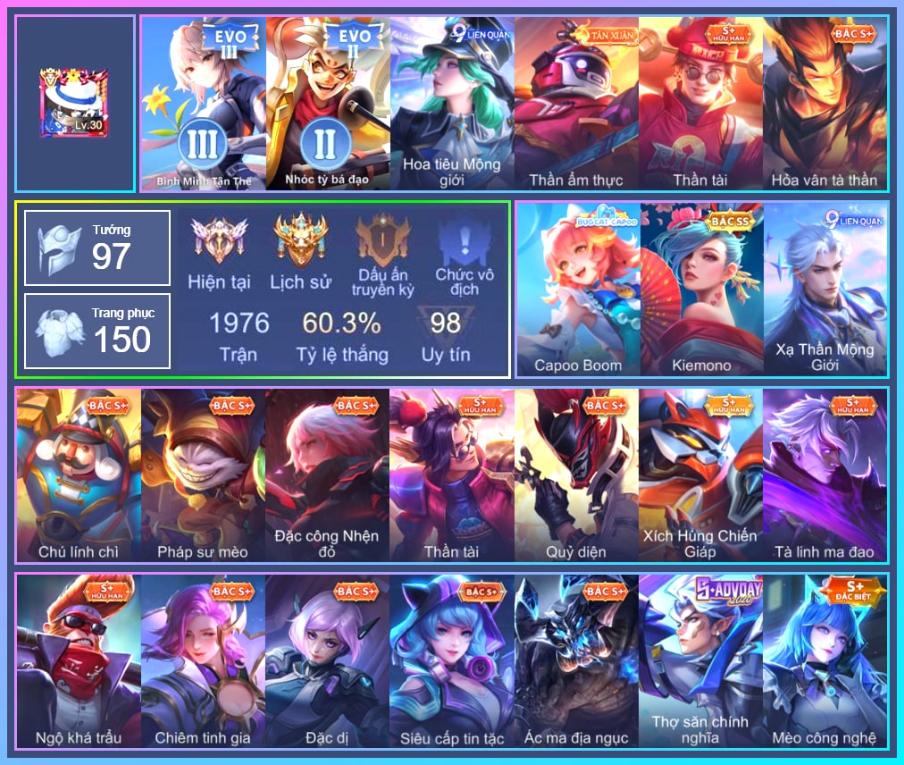Valhein Hoàng tử Quạ, Valhein Thần tài, Valhein Xạ Thần, Valhein S-Quang Vinh, Triệu Vân Quý Công Tử, Triệu Vân Thần Tài, Krixi Thuỷ Thủ, Veera Thiên nga đen, Mina Đào tạo siêu sao, Mganga Pháp sư mèo, Mganga Doombot Hủy Diệt, Grakk Thuyền Trưởng Râu Đỏ, Grakk Khô Lâu Đại Tướng, Grakk Thần ẩm thực, Butterfly Teen Nữ Công Nghệ, Butterfly Bình Minh Tận Thế, Maloch Ác Ma Địa Ngục, Maloch Ác nhân vô tuyến, Annette Xứ sở thần tiên, Preyta Không Tặc, Gildur Đại gia học viện, Gildur Đại võ sư, Sinestrea Giấc mơ trưa, Sinestrea S-Quang vinh, Zuka Giáo Sư Sừng Sỏ, Zuka Phát Tài, Zuka Gấu Nhồi Bông, Zuka Đầu bếp hoàng cung, Zuka Xích Hùng Chiến Giáp, Zephys Phi thương, Zephys Tư lệnh viễn chinh, Zephys Inosuke Hashibira, Arduin, Arduin Tà linh hiệp sỹ, Dirak Quý tộc, Dirak Ông bầu Showbiz, Taara Hỏa Ngọc Nữ Đế, Taara Hồng môn đường chủ, Amily Đặc công nhện đỏ, Amily Hội ám hoàng, Thorne Thám tử trung học, Kaine Đôi Cánh Đại Dương, Kaine Thợ Săn Chính Nghĩa, Lindis Đồng phục Shihakusho, KilGroth Cảnh Vệ Biển, KilGroth Chú lính chì, Kriknak Bọ Cánh Bạc, TelAnnas Cảnh Vệ Rừng, Telannas Dạ hội, TelAnnas Quang Vinh, Tel Annas Jujutsu Sorcerer, Elsu Mafia, Elsu Xạ Thần Mộng Giới, Điêu Thuyền Mèo công nghệ, Paine khúc nhạc tử vong, Ata Quang vinh, Ata Mèo đi mưa, Astrid Bạch Kiếm Tiểu Thư, Astrid Hoa anh đào, Violet Nữ đặc cảnh, Violet Phó học tập, Violet Đặc Dị, Violet Tay Súng Siêu Phẩm, Violet Huy Chương Vàng, Raz Đại tù trưởng, Raz Saitama Cosplay, Raz Mãnh lôi thần quyền, Hayate Bạch ảnh, Hayate Ngân lang, Hayate Quỷ diện, Hayate Bạch lang, Florentino Vũ kiếm sư, Florentino S-Quang Vinh, Richter Dạ hội, Richter Cứu hộ, Nakroth Quán quân, Nakroth Siêu Việt 1, Aleister Quỷ soái nguyệt tộc, Aleister S - Quang Vinh, Dextra Quý cô Tuổi Dần, Keera Thuỷ thủ, Capheny Hầu gái, Capheny Siêu cấp tin tặc, Capheny S-Quang Vinh, Veres Chị đại học đường, Max Găng Tay Vàng, Max Chuyên gia đập hộp, Max Trà Chanh, Volkath Xung thiên thần tướng, Volkath Tư lệnh viễn chinh, Volkath Quang vinh, Omen Chiến binh trăng khuyết, Omen Thuyền trưởng hải tặc, Elandorr Học viện Carano, Yena Hoa tiêu Mộng giới, Slimz Chú thỏ ngọc, Slimz Sứ giả Thiên giới, Quillen Trưởng ngoại khoa, Quillen Tà linh ma đao, Zill Thần mộng mị, Ishar Capoo Boom, Arum Nữ hoàng gấu xám, Fennik Nhà thám hiểm, Fennik Tiệc Bánh Kẹo, Fennik Tay đua F1, Fennik Shipper Siêu thanh, Qi Thiếu nữ pháo hoa, Qi Blogger Ẩm thực, Omega Cỗ Máy Siêu Tốc, Omega Hộ vệ ba bích, Ybneth Candy Bear, Arthur Hoàng kim cốt, Arthur Siêu sao Cricket, Lữ Bố Nam Vương, Kahlii Rối Nước Thuỷ Đình, Sephera Quý tiểu thư, Sephera Chiêm tinh gia, Sephera Phi vụ thế kỷ, Sephera Thủy Liên Hoa, Roxie Tiệc bánh kẹo, Roxie Lễ hội hoa, Errol Vượt ngục, Errol Diệt nguyệt tiên phong, Murad Thợ Săn Tiền Thưởng, Murad S-Quang Vinh, Ngộ Không Ngộ Khá Trẩu, Ngộ Không Nhóc tỳ bá đạo, Ngộ Không Cổ thần Ai Cập, Yan nhà chế tác, Laville Tay đua đường phố, Ryoma Dạ hội, Liliana Hồ Quý Phi, Liliana Thuỷ thủ hồ ly, Airi Thích Khách, Airi Quái xế công nghệ, Airi Kiemono, Tulen Phù Thủy Kiến Tạo, Rouie Quang Vinh, Rourke Cuồng tặc, Azzenka Quang Vinh 2.0, AzzenKa Giáng sinh An lành, Azzenka U Hồn Sa Mạc, Ilumia Diva nổi loạn, Enzo Phẩm chất quý tộc, Enzo Thần thoại Hy Lạp, Celica S-Quang Vinh, Xeniel Kim sí điểu, Bonnie S Quang Vinh, Caesar Bão tố, Lorion Hoả vân tà thần