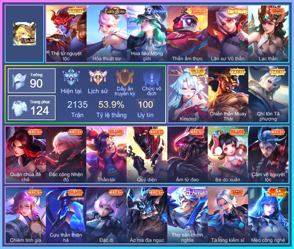 Valhein Số 7 Thần Sầu, Valhein S-Quang Vinh, TelAnnas Giám thị thân thiện, TelAnnas Chung Tình Tiễn, Telannas Dạ hội, TelAnnas Quang Vinh, Arthur Hoàng kim cốt, Arthur Siêu sao Cricket, Arthur Đặc cảnh băng lôi, Krixi Phó văn nghệ, Krixi Thuỷ Thủ, Violet Phi Công Trẻ, Violet Đặc Dị, Violet Huy Chương Vàng, Butterfly Teen Nữ Công Nghệ, Butterfly Quận Chúa Đế Chế, Butterfly Bình Minh Tận Thế, Lữ Bố Nam Vương, Alice Xứ sở thần tiên, Alice bé du xuân, Natalya Quý Cô Thủy Tề, Triệu Vân Quý Công Tử, Triệu Vân Thần Tài, Allain Lân sư Vũ thần, Maloch Ác Ma Địa Ngục, Maloch Samurai Tử Sĩ, Maloch Ác nhân vô tuyến, Maloch Đại ca Mukbang, Stuart Trò đùa tử vong, Stuart Vua hề, Stuart Gã hề, Yorn Thế Tử Nguyệt Tộc, Yorn Đặc Nhiệm Swat, Zephys Phi thương, Zephys Tư lệnh viễn chinh, Zephys Inosuke Hashibira, Grakk Thần ẩm thực, Zata Chí tôn Tà Phượng, Ngộ Không Đạo tặc, Ngộ Không Cổ thần Ai Cập, KilGroth Cảnh Vệ Biển, Amily Đặc công nhện đỏ, Amily Hội ám hoàng, Qi Thiếu nữ pháo hoa, Qi Blogger Ẩm thực, Gildur Đại gia học viện, Gildur Đại võ sư, Florentino Vũ kiếm sư, Florentino Thần thoại Hy Lạp, Florentino Tà long kiếm sĩ, Elandorr Học viện Carano, Hayate Bạch ảnh, Hayate Quỷ diện, Hayate Bạch lang, Kahlii Siêu đầu bếp, Sephera Chiêm tinh gia, Murad Thợ Săn Tiền Thưởng, Murad S-Quang Vinh, Roxie Lễ hội hoa, Roxie Hỏa thuật sư, Bright Kỳ Lân Soái, Raz Đại tù trưởng, Raz Chiến thần Muay Thái, Raz Saitama Cosplay, Airi Thích Khách, Airi Cấm Vệ Nguyệt Tộc, Airi Đặc công tử điệp, Elsu Tuyết ưng, Nakroth Quán quân, Nakroth Producer Tia chớp, Ryoma Thợ Săn Tiền Thưởng, Ryoma Đại Tướng Nguyệt Tộc, Ryoma Dạ hội, Ryoma Ailing Samurai, Veres Kimono, Superman Chúa Tể Công Lý, Tulen Dạ hội, Mganga Doombot Hủy Diệt, Zuka Đại Phú Ông, Zuka Gấu Nhồi Bông, Zuka Rapper Big Panda, Fennik Nhà thám hiểm, Fennik Đội đặc nhiệm, Fennik Tay đua F1, Lauriel Đọa Lạc Thiên Sứ, Lauriel Lạc thần, Lauriel Nữ vương học đường 2, Enzo Phẩm chất quý tộc, Enzo Chiến binh trăng khuyết, Enzo Thần thoại Hy Lạp, Enzo Nhà Leo núi, Tachi Đao khách vô tình, Rouie Sứ giả vũ trụ, Rouie Quang Vinh, Zill Cựu thần thiên hà, Zill Thần mộng mị, Omen Ám tử đao, Xeniel Thiên Sứ Hủy Diệt, Xeniel Kim sí điểu, Richter Dạ hội, Richter Quang vinh 2.0, Richter Cứu hộ, Capheny Hầu gái, Capheny S-Quang Vinh, Taara Hỏa Ngọc Nữ Đế, Yena Nữ hoàng thể thao, Yena Hoa tiêu Mộng giới, Điêu Thuyền Nữ Vương Anh Đào, Điêu thuyền Vũ điệu nghê thường, Điêu Thuyền Mèo công nghệ, Slimz Sứ giả Thiên giới, Dextra Lữ khách cao nguyên, Sinestrea S-Quang vinh, Keera Hồ điệp, Baldum Đồ chơi, Celica S-Quang Vinh, Ilumia Ngược dòng thời gian, Omega Hộ Vệ Carano, Zip Cá siêu quậy, Volkath Quang vinh, Kaine Thợ Săn Chính Nghĩa, Bonnie S Quang Vinh, Marja Linh Xà Tư Tế, Ignis Hỏa Thuật Sư